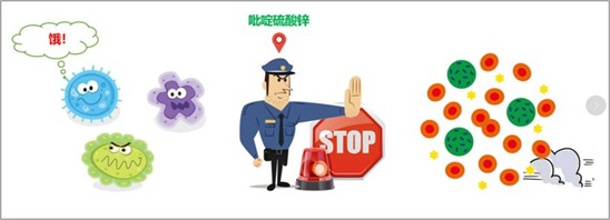 微生物通過離子運(yùn)輸營養(yǎng)維持生長繁殖,吡啶硫酮通過破壞微生物的該運(yùn)輸方式,讓營養(yǎng)運(yùn)輸不進(jìn)去,使得細(xì)菌最終被“餓死”。同時,鋅離子本身也具有一定的抑菌能力。因此,吡啶硫酮鋅在殺菌的同時,本身并未被消耗,可反復(fù)殺菌,具有高效、長效的殺菌能力。